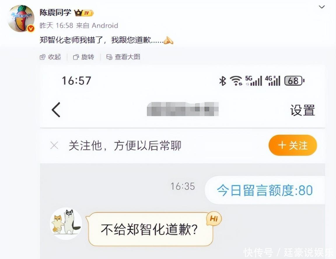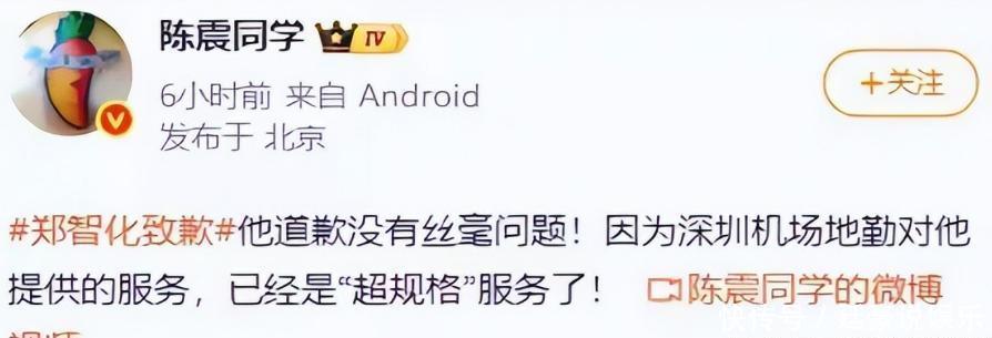 他表示自己的用词是因为“一时气愤”,但是因为郑智化并没有道歉,很多网友依然不肯买账,对郑智化的声讨甚至已经上升到了他的人品上。这个时候,陈震突然发声,表示郑智化在深圳机场已经是“超规格待遇”了,他的话更是如同烈火中添了一把干柴。
