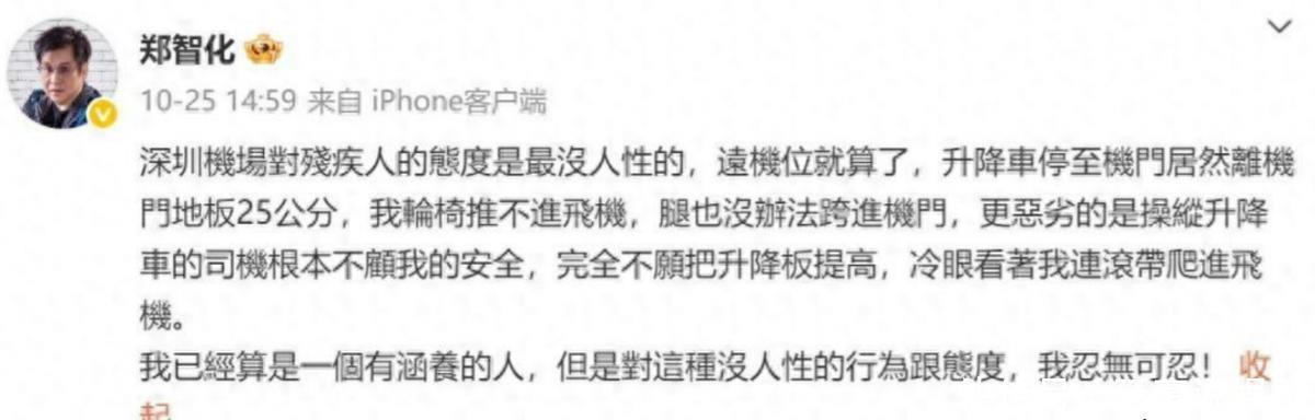 郑智化有理由吐槽深圳机场,他也有资格吐槽深圳机场,因为深圳机场如果为了减少设备损失风险,要保证安全高度差,那也就意味着他们很清楚,他们的设置达不到无障碍服务要求。既然如此,他们就应当提供无障碍渡板来设置斜坡,确保轮椅使用者通行正常,而不是让三个工作人员又是抬又是推,甚至还要郑智化自己伸手进入飞机!